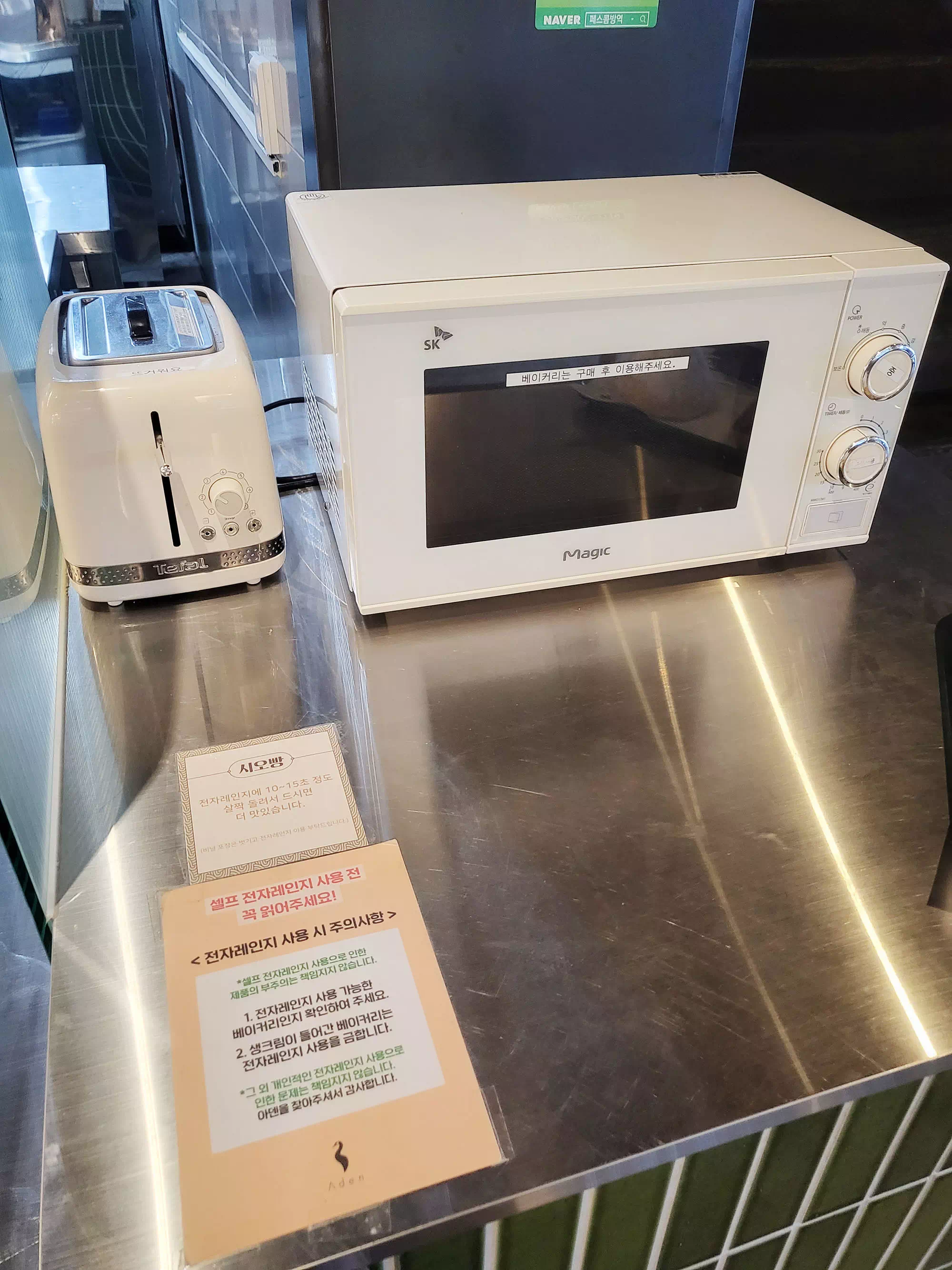 베이커리 카페인 아덴에서 빵을 주문 시 기호에 맞게 전자레인지를 이용해 셀프로 데워드실 수 있습니다.