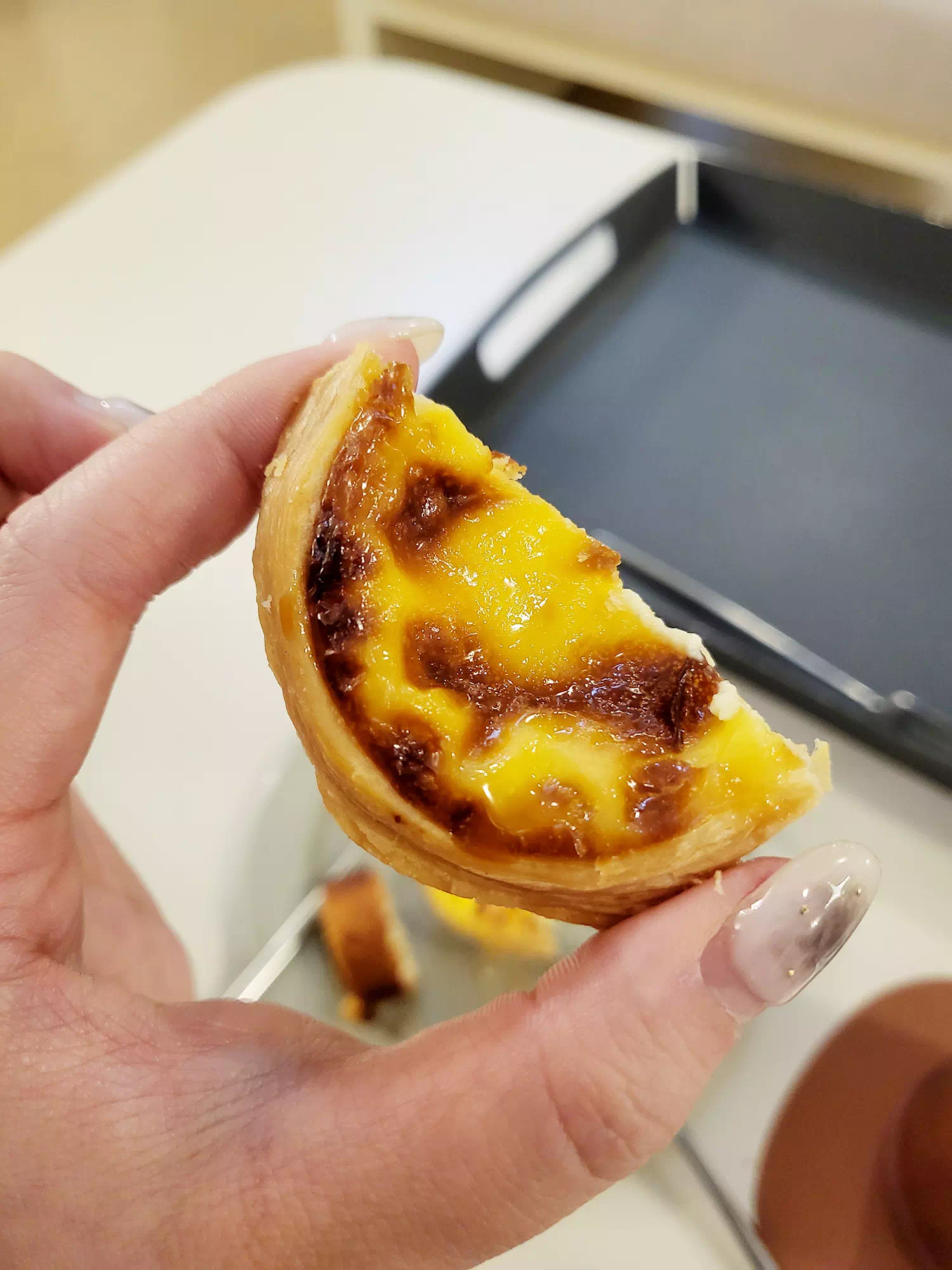 에그타르는 크림처럼 촉촉한 식감과 함께 달콤하고 부드러운 맛이 느껴졌습니다. 부드러운 크림치즈와 계란의 풍미가 균형 있게 어우러져 있으며 부드럽게 익힌 계란과 크림이 입안에서 살살 녹아내립니다.