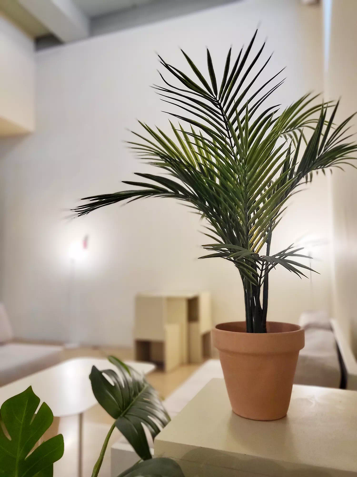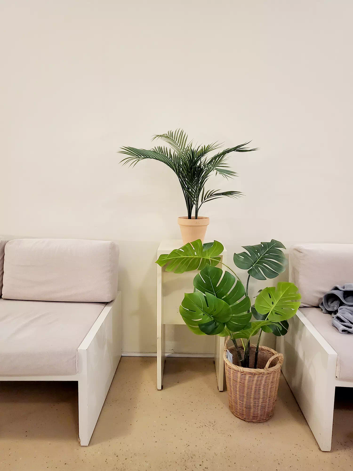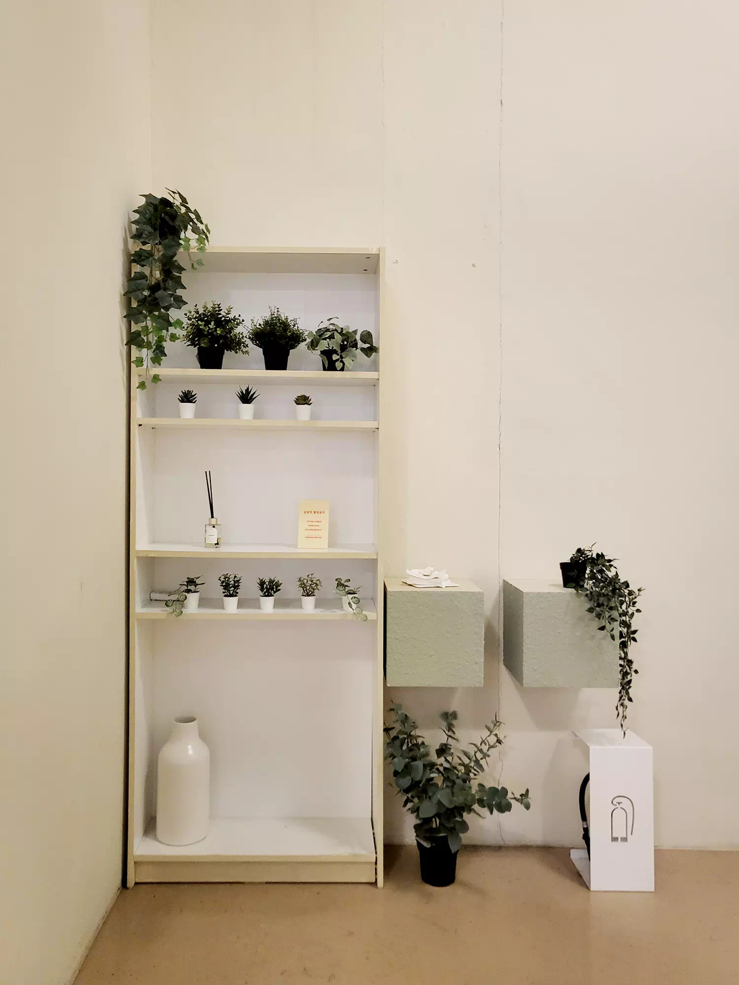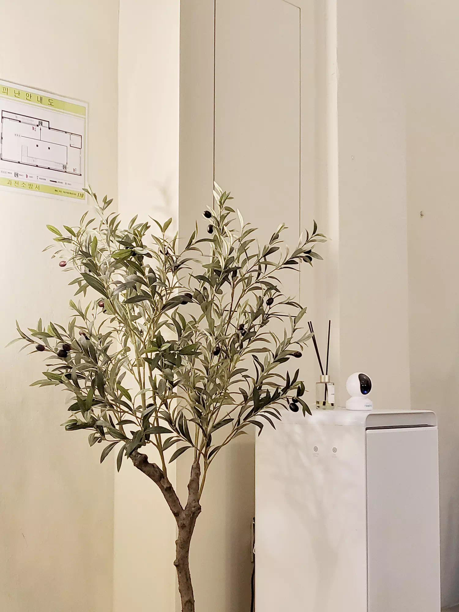 언트는 곳곳에 작은 식물들이 예쁘게 배치되어 있습니다. 다양한 종류의 식물들이 코너 또는 벽면에 자리해 있어, 이는 차분한 느낌을 선사한다고 생각합니다.