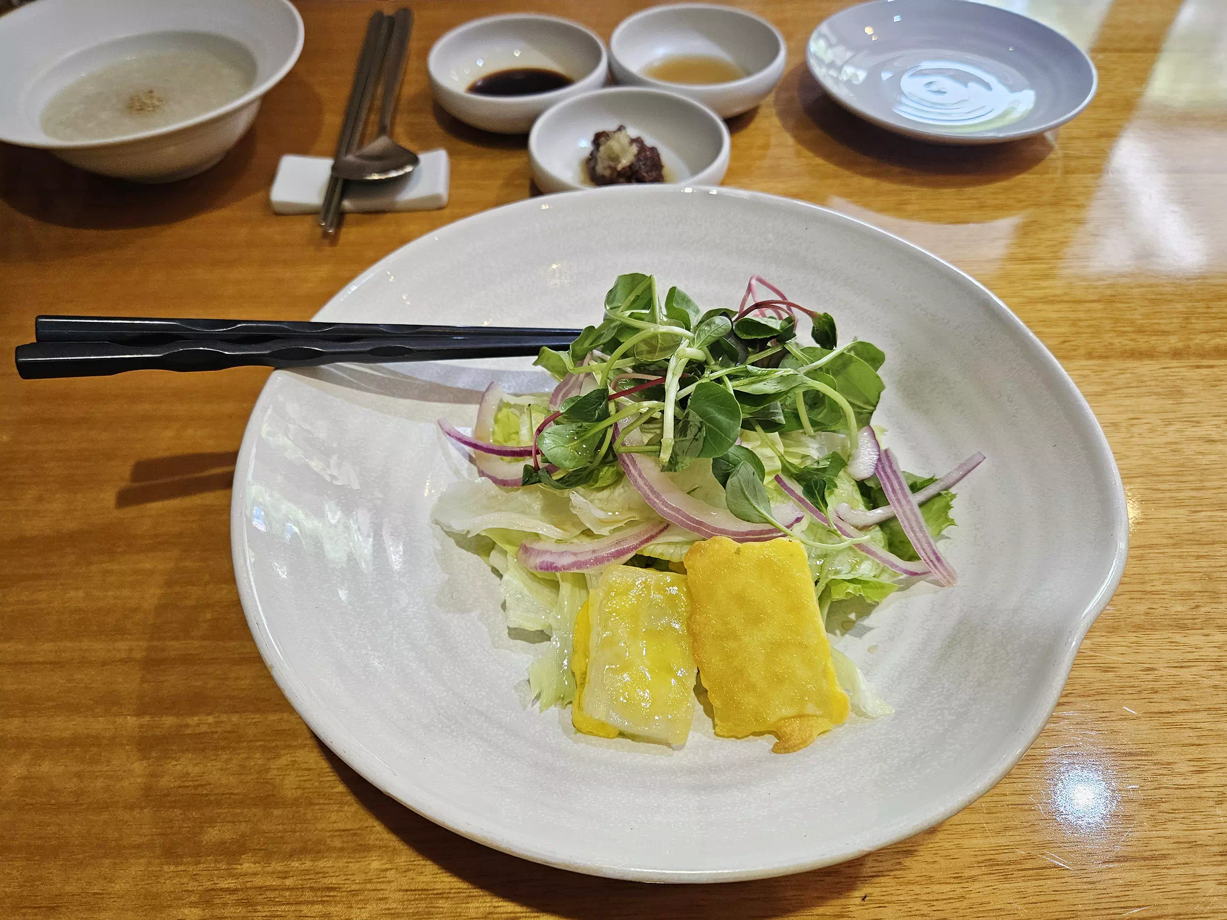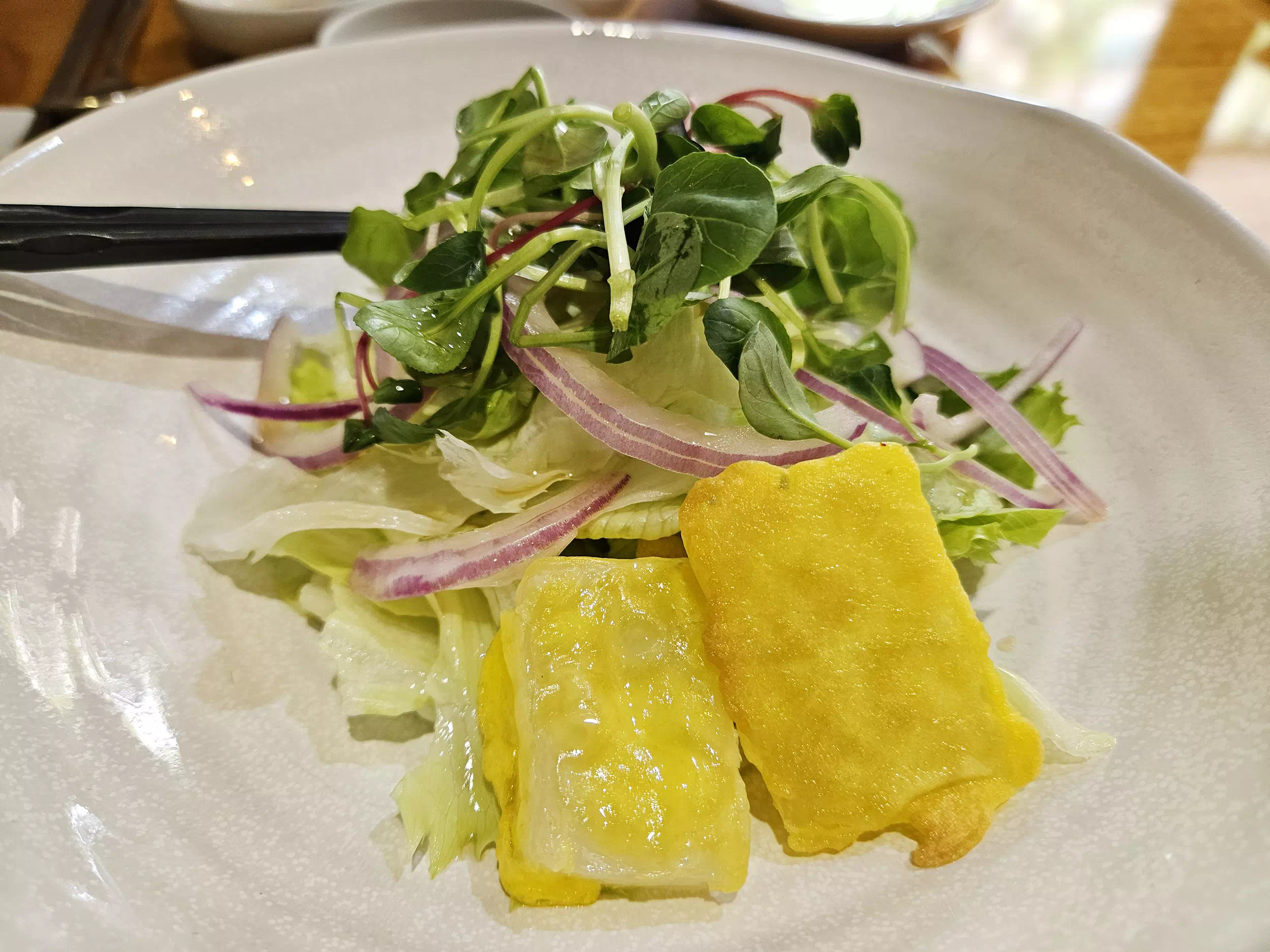 먼저 샐러드가 준비됩니다. 아쉬웠던 점은 단비에선 음식설명이 거의 제로입니다. 서빙될 때 간단하게라도 무엇인지, 어떻게 먹는지 설명을 해주면 좋을 텐데 어~~ 쩌다 생각나면 해주시는 느낌이었습니다.