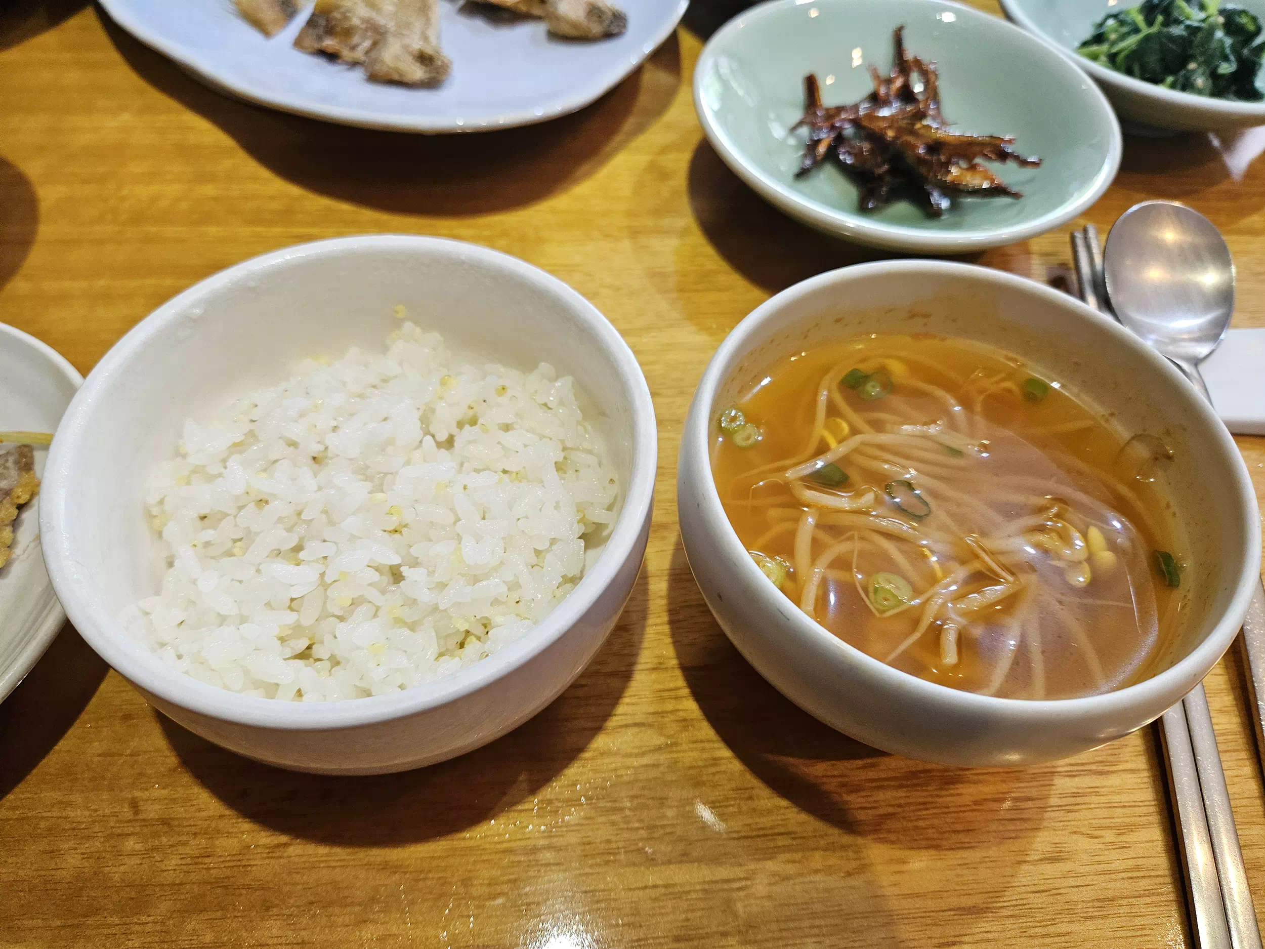 밥은 따뜻한 콩나물국과 함께 제공됩니다.